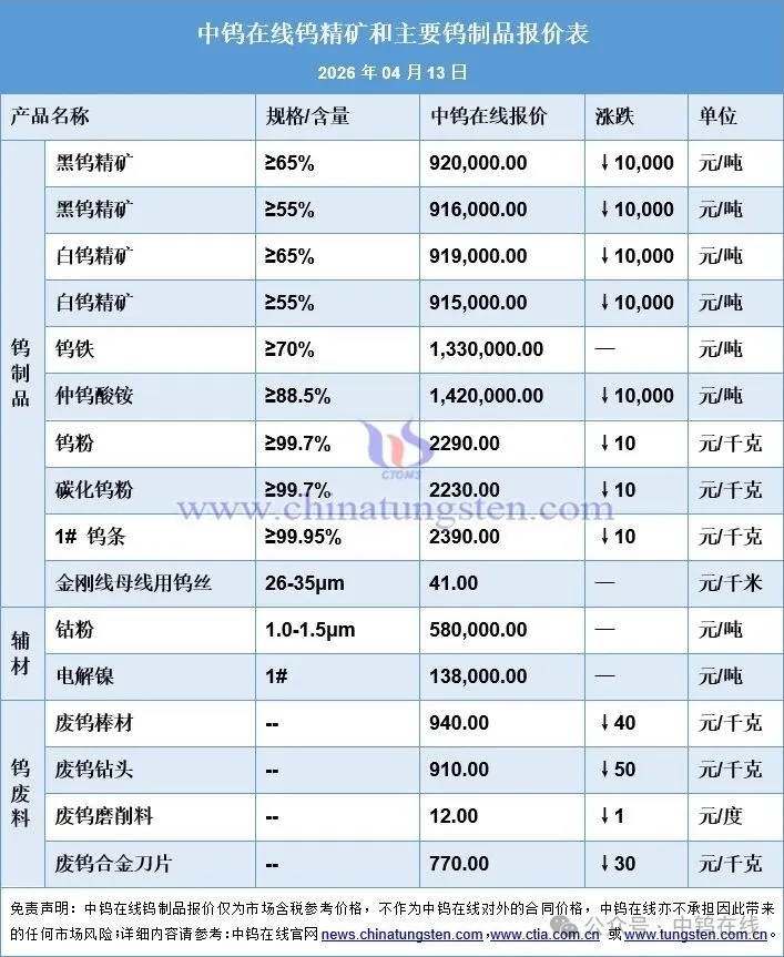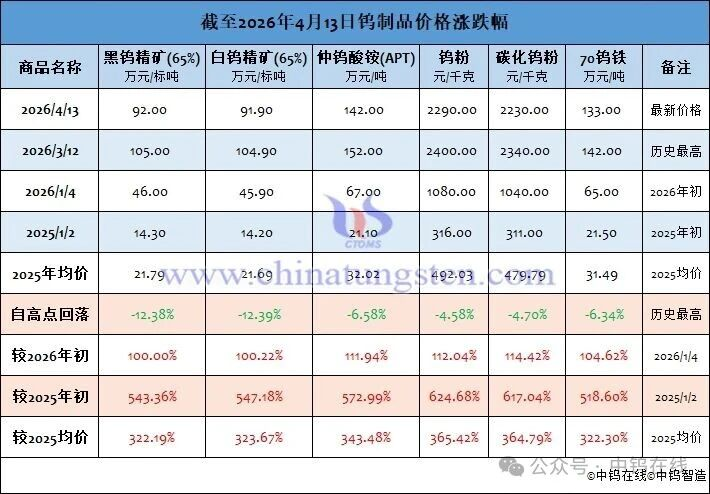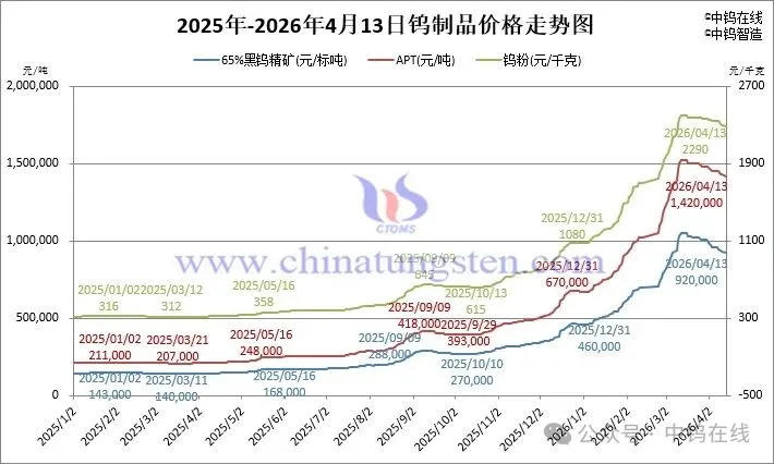 As of April 13, 2026, the tungsten market has continued its trajectory of rational correction and consolidation. While recent market indicators suggest a slight downward adjustment in spot prices, a macro perspective reveals a striking reality: major tungsten derivatives have still surged by over 100% since the beginning of the year. From wolframite concentrates to Ammonium Paratungstate (APT), the cost base for industrial manufacturing has fundamentally shifted to a new, higher plateau.